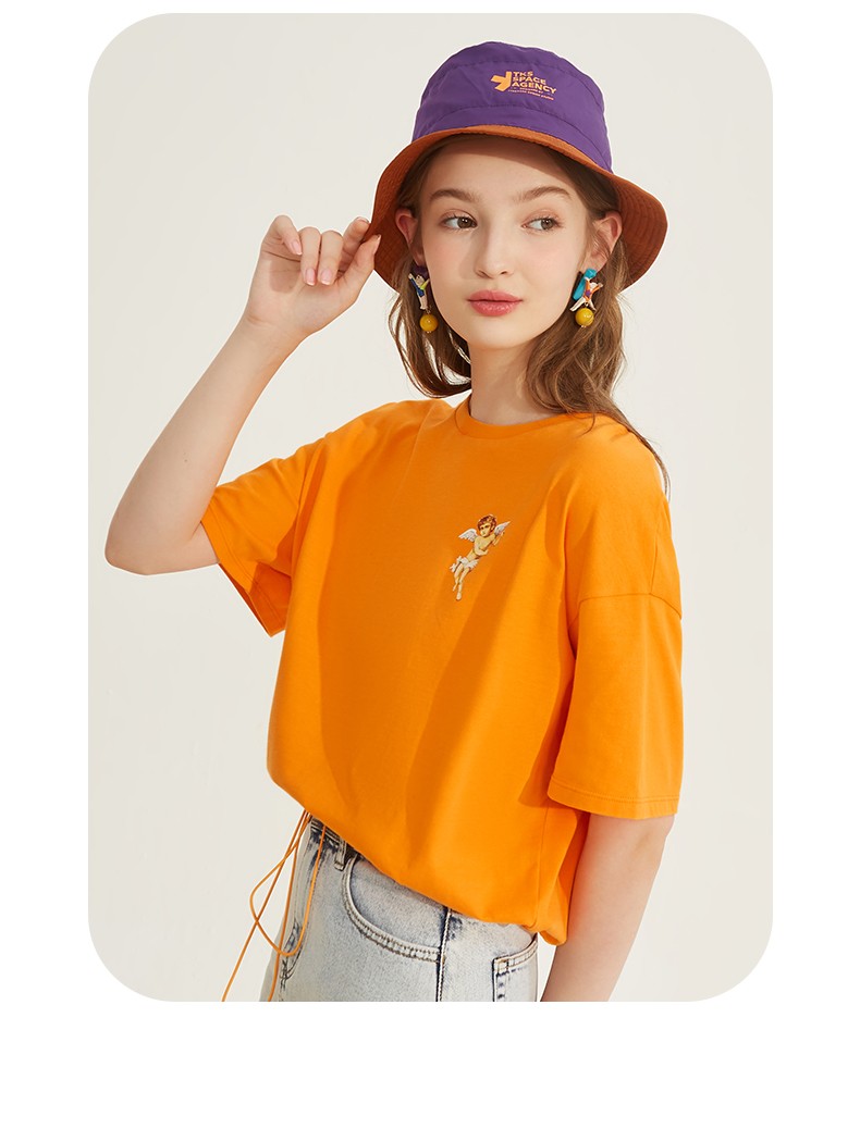 トップ Tシャツ 純粋なオンラインブランドA 21夏に、2020レイディ・スーフを新着しています。ファンシー・ファッション百合女商売のゆったりとしたカラーが肩に落ちます。Tシャッツプリントの半袖シャツF 42231031。カラーは165/88 A/Lです。