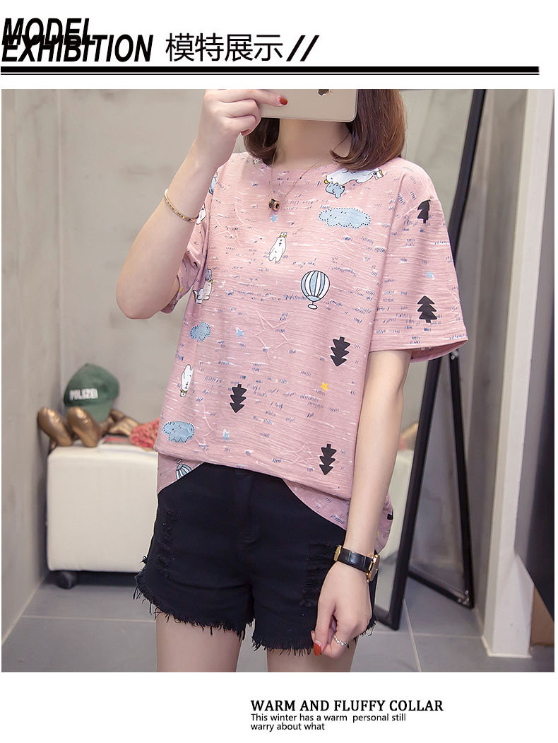 尚涛t恤女半袖2022春夏韩版宽松体恤半袖女显瘦百搭休闲レディースファッション上衣打底衫 粉色热气球+灰色星星 XL 建议115-125斤
